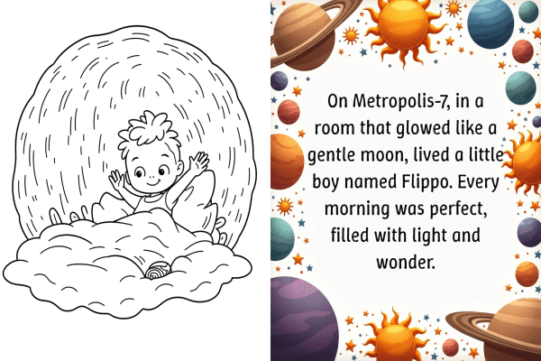 The first part of the Flippo Saga, in which Flippo is aged 4 to 9. He undertakes his first easier missions to the solar system and to Earth, and learns about the first threats to himself, his world, and the Earth for which he will become the Guardian of the Timeline.